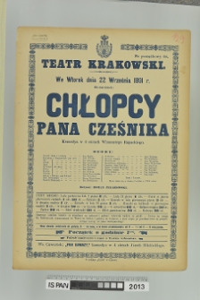 Digitalizacja zrealizowana w ramach Narodowego Programu Rozwoju Humanistyki. Projekt: "Polski afisz teatralny XVIII - XX wieczny. Naukowe opracowanie i udostępnianie do dalszych badań historyczno-teatralnych afiszów ze zbiorów Instytutu Sztuki PAN".