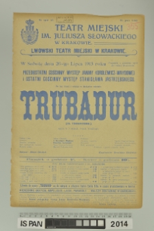 Digitalizacja zrealizowana w ramach Narodowego Programu Rozwoju Humanistyki. Projekt: "Polski afisz teatralny XVIII - XX wieczny. Naukowe opracowanie i udostępnianie do dalszych badań historyczno-teatralnych afiszów ze zbiorów Instytutu Sztuki PAN".