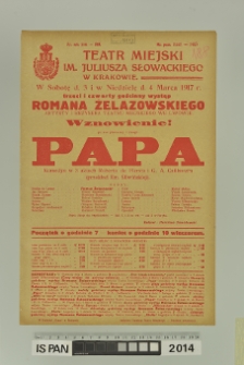 Digitalizacja zrealizowana w ramach Narodowego Programu Rozwoju Humanistyki. Projekt: "Polski afisz teatralny XVIII - XX wieczny. Naukowe opracowanie i udostępnianie do dalszych badań historyczno-teatralnych afiszów ze zbiorów Instytutu Sztuki PAN".