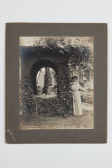 Helena Modrzejewska przy murowanym, dekoracyjnym łuku obrośniętym bluszczem, fot. naklejona na szarej tekturze 20x25 [27x31]