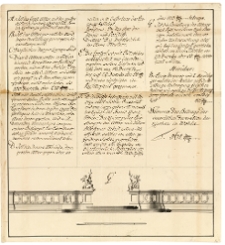 Pióro, pędzel, tusz, akwarela ; papier z filigranem X i kontramarką 1 ; na karcie cztery rysunki, każdy w osobnej ramce, 457 × 1295 mm (wymiary całej karty), wymiary kolejnych ramek, od lewej: 430 × 280 mm ; 430 × 282 mm ; 430 × 277