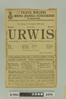 Digitalizacja zrealizowana w ramach Narodowego Programu Rozwoju Humanistyki. Projekt: "Polski afisz teatralny XVIII - XX wieczny. Naukowe opracowanie i udostępnianie do dalszych badań historyczno-teatralnych afiszów ze zbiorów Instytutu Sztuki PAN".